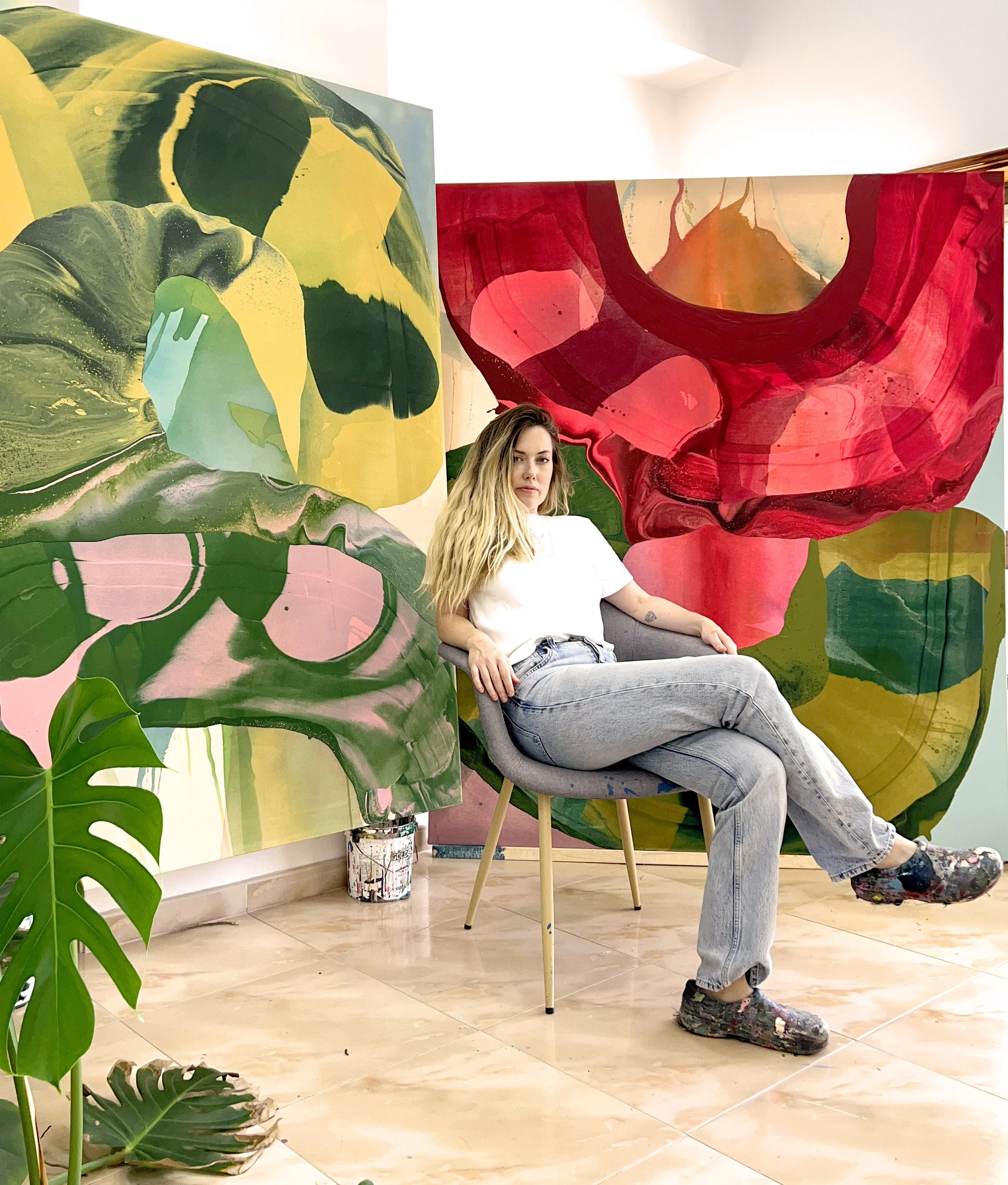 Hers is a delicately balanced and intuitive process. “Each pouring of paint is a form of navigation. It’s a terrain of uncertainty, knowing precisely when to halt or trust my instincts to push the boundaries further. I am constantly acting and reacting to what’s happening on the canvas. It’s quite physical. In a way it’s almost spiritual, being able to think and see without a predetermined image, I’m reaching toward unlimited possibilities.”